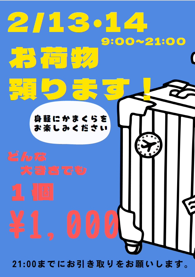 2/13・14の雪まつり期間中、時間を延長して手荷物をお預かりします!